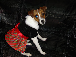 Actually, the reason she looks so calm in this picture is that she is high as a kite on Tramadol. She just got spayed yesterday, and her pain meds are keeping her very mellow. She's got a few days left on this prescription while her sutures heal, and I think it's making the craziness of the season much easier for her to handle. I recommend it for everyone at the holidays. The Tramadol I mean, not the spaying...I have taken no end of shit from others in Flockhall for buying this little outfit. The very same people, mind you, who wanted desperately to dress her up for Halloween. I argued that she didn't need a halloween costume because she wasn't going trick-r-treating (she can't reach the doorbells) but she IS going to Grandma's house for Christmas, so a new outfit was a must. At least I stopped myself from getting the fuzzy red boots...